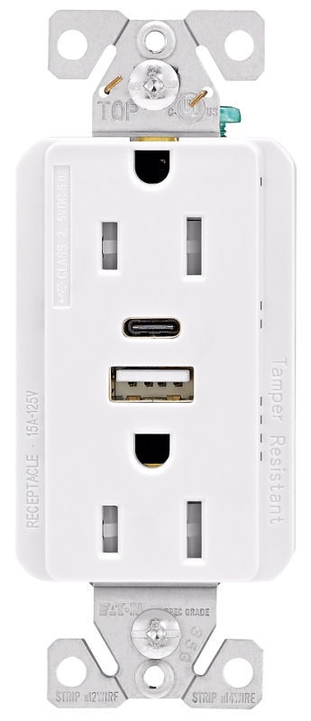 Eaton Cooper Wiring TRUSBAC15 Receptacle, Duplex, 125 VAC, 5 A, 130 kHz Frequency, 2 Pole, 3 Wires, 2 USB Ports, Type A, C USB, Back and Side Wiring, 10 to 14 AWG Wire, NEMA 5-15R, -4 to 140 deg F Operating, Strap Mounting, Thermoplastic/Steel, White, Dimensions: 4.19 in H x 1.3 in W x 1.67 in D