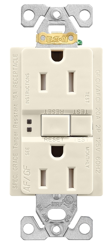 Eaton Wiring Devices Duplex Receptacle Wallplate, 125 V, 15 A, 60 Hz Frequency, 2 Pole, 3 Wires, Back, Side Wiring, 14 to 10 AWG Wire, 5-15R, 30 deg C Operating, PVC/Thermoplastic, Light Almond, Dimensions: 2.81 in L x 2.01 in W x 4.62 in H, Includes: Thermoplastic Wallplate