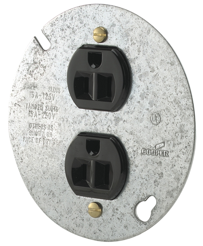Commercial specification-grade straight blade receptacle on 4 in galvanized steel cover. Back and side wire. 15 A, 125 V. 5-15R NEMA. Temperature rating of -20 to 60 deg C. UL listed, meets all CSA requirements, NOM Certified.