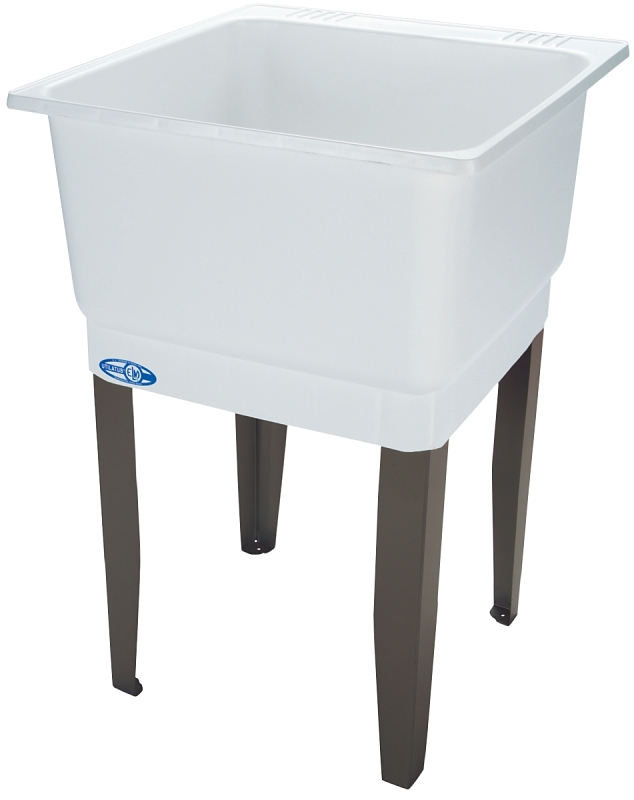 1-piece molded construction, using Mustee’s Co-Polypure resin, 20 gal capacity, extra deep 13 in tub with smooth surface, leak-proof, integrally molded-in drain with stopper, connects to standard 1-1/2 in P or S trap, accommodates dual-handle faucet with 4 in center, includes finished steel legs with adjustable levelers, mold and mildew-resistant components. 33 in H x 23 in W x 25 in D.
