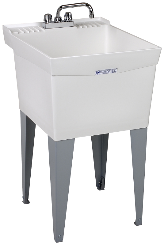 ELM UTILATUB Laundry Tub Combo Kit, 18 gal, Bowl Width: 20 in, Bowl Depth: 13 in, Bowl Height: 14-3/8 in, Faucet Included: Yes, Number of Bowls: 1, Number of Deck Holes: 2, Drain Outlet Size: 1-1/2 in, Drain Opening Size: 1-1/2 in, Thermoplastic, White, Color-fast white, Floor Mounting, 20 in OAW, Overall Depth: 24 in, 34 in OAH, Includes: Adjustable Leg with Levers, Faucet, P-Trap, Supply Lines and Stopper