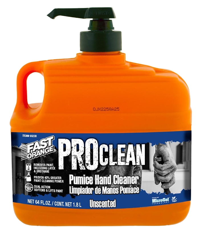 Fast Orange® PROClean hand cleaner is designed with one unique goal in mind, remove troublesome paint stains and messes from skin. The dual-action formula uses pumice which gets into all the creases to break down latex and urethane paints while the patented Microgel drills deep into the stain to effortlessly release it from skin. Fast Orange® premium skin conditioners including lanolin, aloevera and jojoba moisturize dry, cracked hands.
