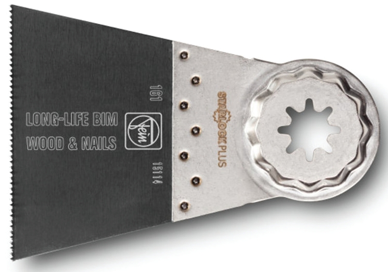 Bi-metal with teeth set for all woods, plasterboard and plastic materials. Very clean cut and excellent work progress. Extremely robust, unaffected by nails in wood (up to approximately 3/16 in Dia), masonry. 2-9/16 in W x 2 in L. Wide shape for maximum cutting performance and long straight cuts.