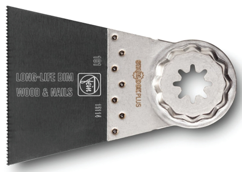 Bi-metal with teeth set for all woods, plasterboard and plastic materials. Very clean cut and excellent work progress. Extremely robust, unaffected by nails in wood (up to approximately 3/16 in Dia), masonry. 2-9/16 in W x 2 in L. Wide shape for maximum cutting performance and long straight cuts.
