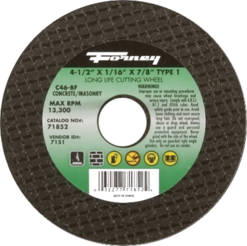 Forney 71852 Cut-Off Wheel, 4-1/2 in Dia, 1/16 in Thick, 7/8 in Arbor, 24 Grit, Coarse, Silicone Carbide Abrasive