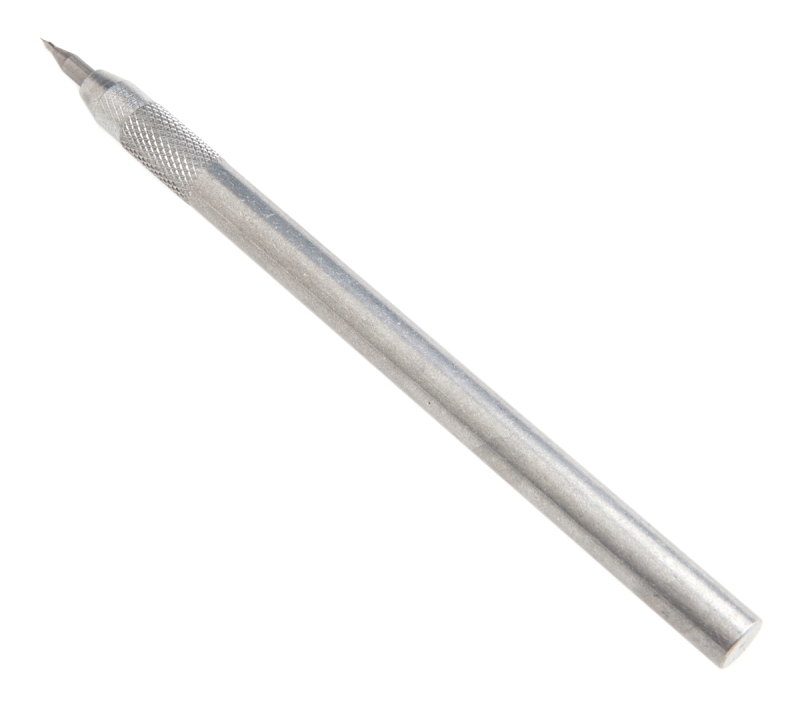 Premium scribe, useful marking tool featuring a handy pocket clip, knurled aluminum handle and tungsten carbide tip. Cuts glass.