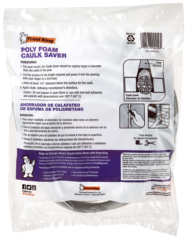 Frost King C22H Caulk Saver, 1/2 in Dia, 20 ft L, Polyfoam, Gray
