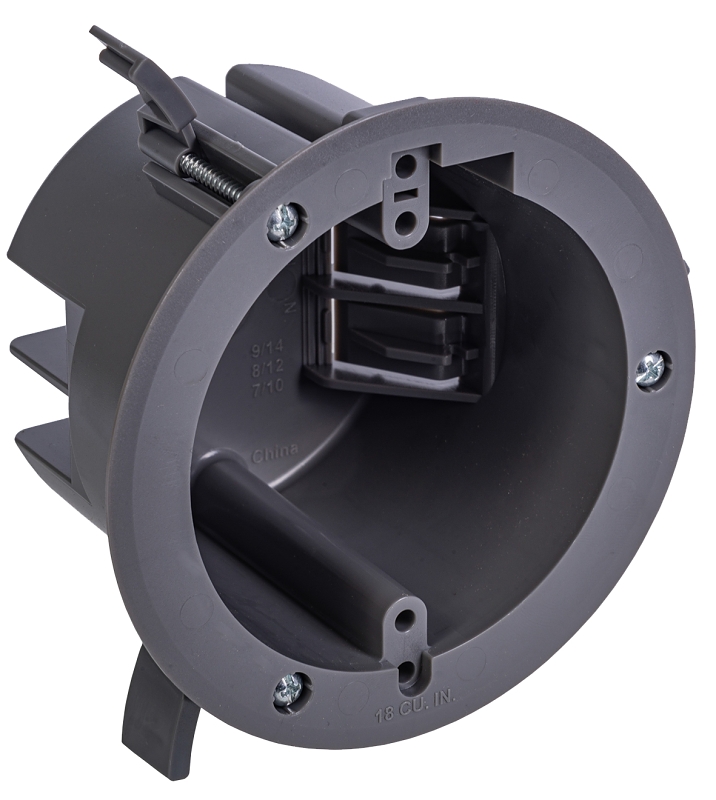 GB Electrical Box, Cable Entry: Hinge, Number of Gangs: 1, Cubic Capacity: 18 cu-in, Round, Polycarbonate, Gray, 4.4 in W, 4.4 in D, 2.7 in H, Clamp, In-Ceiling Mounting, Suitable for: Non-Metallic Sheathed Cable and Up to 6 lb Light Fixture Installation, Includes: (2) Swing Clamps and Mounting Ears