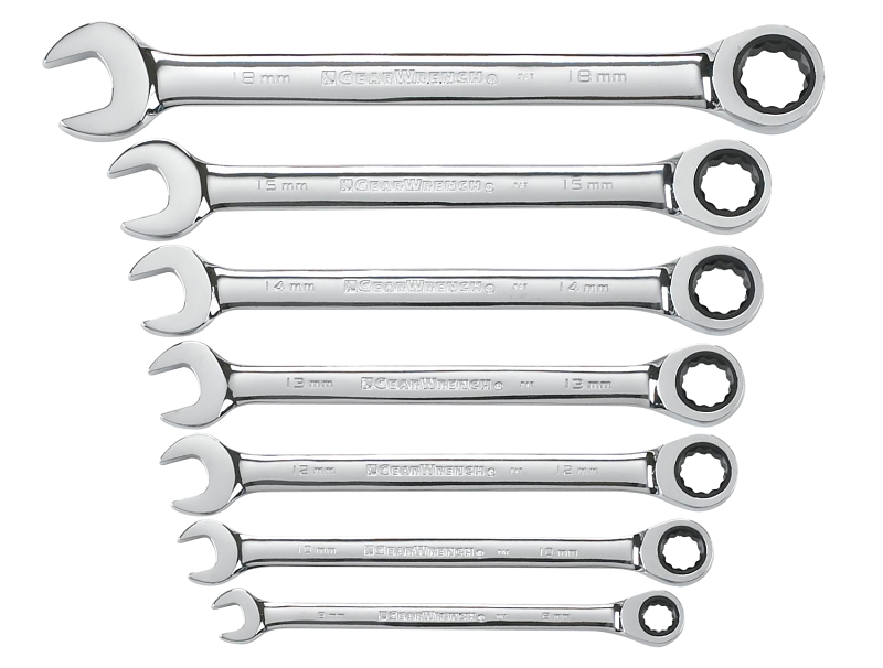 Set of full polish, fine-toothed combination ratcheting wrenches with Surface Drive Plus Technology. Combines the speed of a ratchet and the access capabilities of a wrench. Includes 8 mm, 10 mm, 12 mm, 13 mm, 14 mm, 15 mm and 18 mm wrenches.