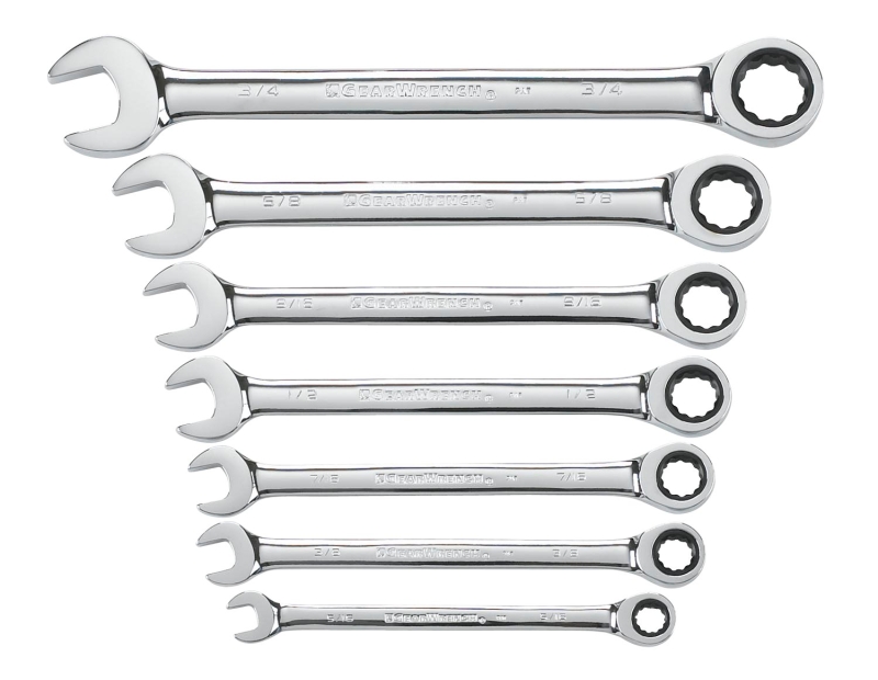 Set of full polish, fine-toothed combination ratcheting wrenches with Surface Drive Plus Technology. Combines the speed of a ratchet and the access capabilities of a wrench. Includes 5/16 in, 3/8 in, 7/16 in, 1/2 in, 9/16 in, 5/8 in and 3/4 in wrenches.