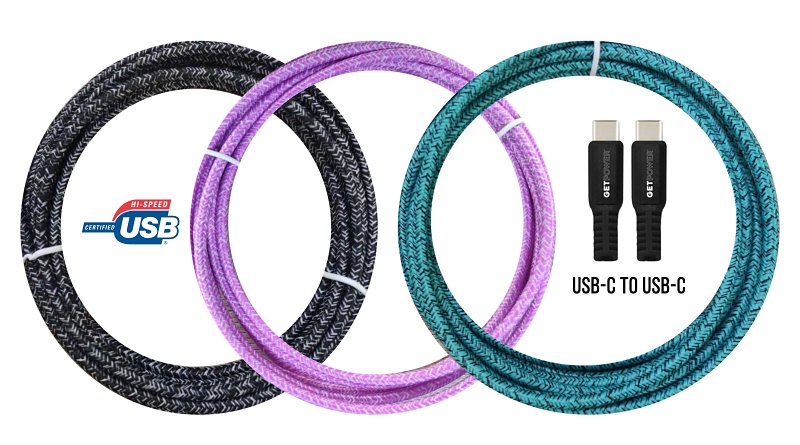 GetPower GP-XL-BRDC-C Power Delivery Braided Charging Cable, USB-C, USB-C, 10 ft Cable, Multi-Color