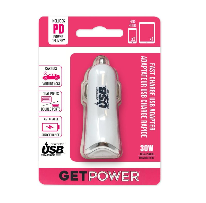 GetPower Dual Port DC Car Adapter, 2.4 A Output Current, 18 W Output, Plastic Housing Material, White Housing, Dimensions: 4.5 in L x 3.4 in W x 1.3 in H, Suitable for: Devices That Support USB Power Delivery