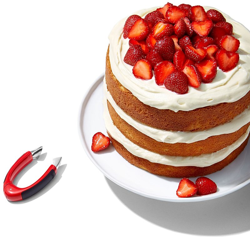 Prep pounds of strawberries quickly and easily. The OXO Good Grips strawberry huller is designed with stainless steel, tapered blades that make quick work of strawberry hulls without wasting any precious fruit. The soft, non-slip handle and unique hinged design absorb pressure, so you stay comfortable whether hulling strawberries for snacks or baking. The Huller works with strawberries of all shapes and sizes and is also great for tomatoes. Dishwasher safe.