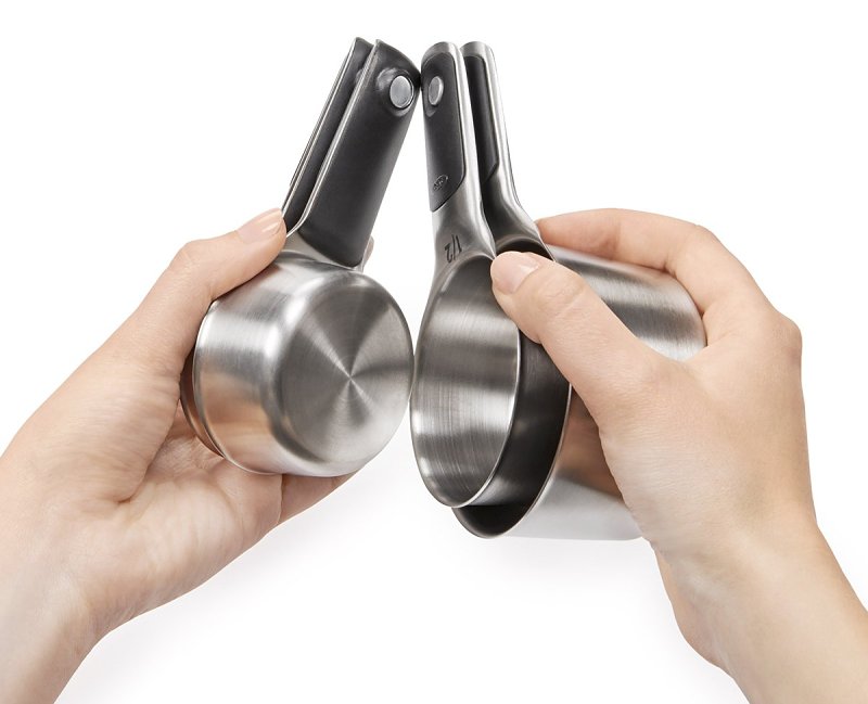 The stainless steel measuring cup’s unique magnetic feature keeps the cups neatly stacked together and allows you to easily remove one at a time. The cups feature permanent etched measurement markings and have soft, comfortable, non-slip handles.