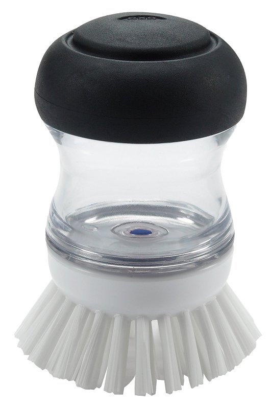 Dispense soap on demand with our soap dispensing palm brush. With a light push of the button, soap shoots out and onto the item being scrubbed. Contoured shape for optimal comfort and scrubbing power. Durable nylon bristles are safe for non-stick cookware and bakeware.