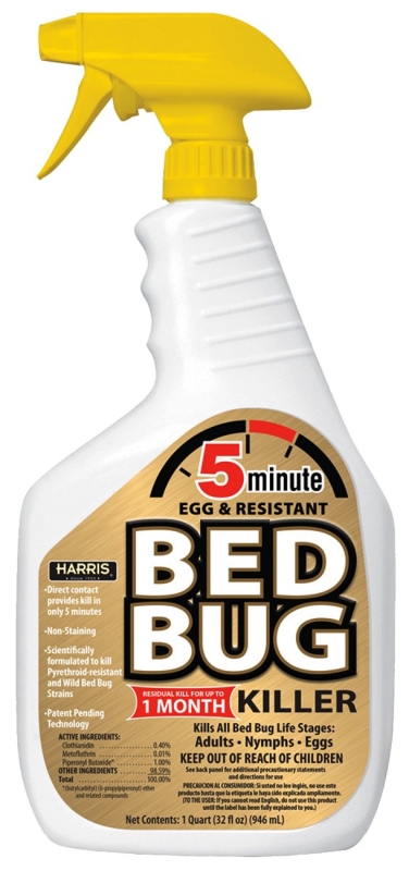 Harris 5 Minute™ bed bug killer uses patent pending technology to kill bed bugs in just 5 mins after initial contact. In addition to the quick kill, the spray features a residual that lasts 1 month. A few additional benefits include EPA acceptance for application on all parts of the mattress, not just tufts and folds. Harris 5 Minute™ bed bug killer is odorless, non-staining and kills pyrethroid-resistant bed bugs and their eggs. With a quick time to kill, 1 month residual kill and EPA accepted application on the entire mattress, this formula makes a great addition to the Harris bed bug product line.