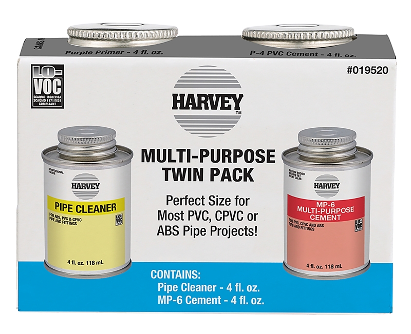 Convenient project pack contains 4 oz all-purpose pipe cleaner and 4 oz multi-purpose solvent cement. For most ABS, PVC or CPVC projects. Twin pack.