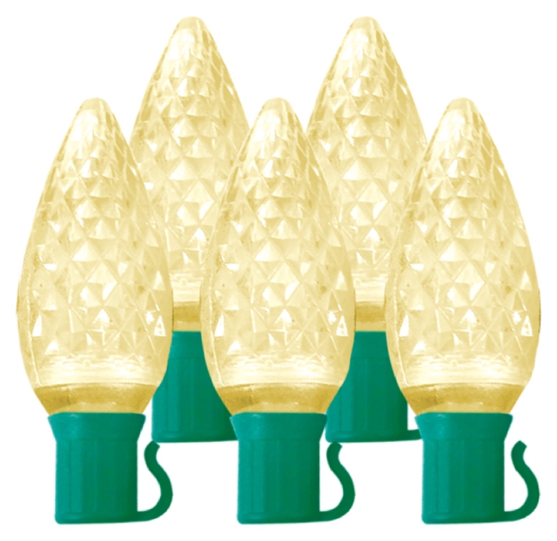 These energy efficient and long-lasting C9 LED lights are available in a spool of 70 (The length is 47.3 ft L). These C9 LED lights have 7.7 in spacing between sockets on a green wire with end to end connectors so you can connect multiple sets.