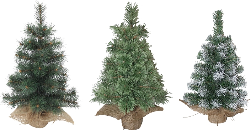 Assortment of 3 mini trees seated in burlap bag bases for a rustic look. The small and compact trees make perfect holiday accents for seasonal decorating.