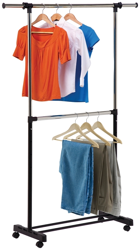 Sitting on smooth rolling casters, the rack moves easily from room to room. Features two hanging bars and adjustable height and width for 90 in of hanging space. Some assembly required. Dimensions of 60 in W x 17 in D x 73 in H.