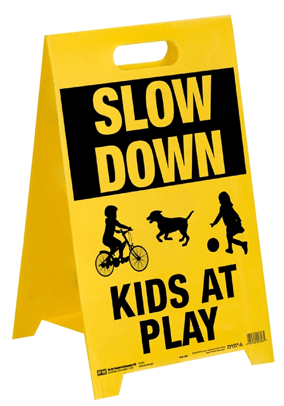 Hy-Ko Sign Stand, Language: English, Legend: SLOW KIDS AT PLAY, Legend Color: Black/Yellow, Plastic, Dimensions: 20-1/4 in H X 12-1/4 in W x 3/4 in D