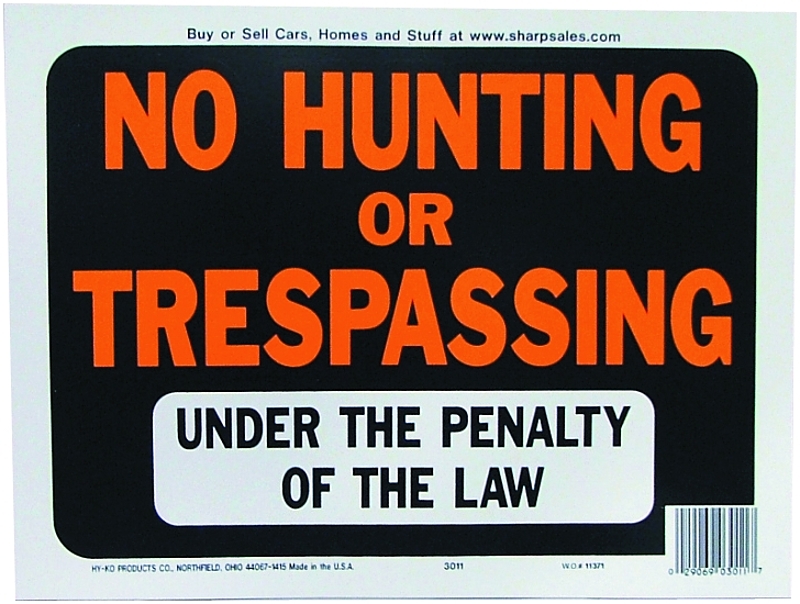 Brightly visible, fluorescent letters on a black background. Durable plastic, weatherproof. Sign states “NO HUNTING or TRESPASSING”. Can be used as refill for assortments# P-3100 and WMP-6960.