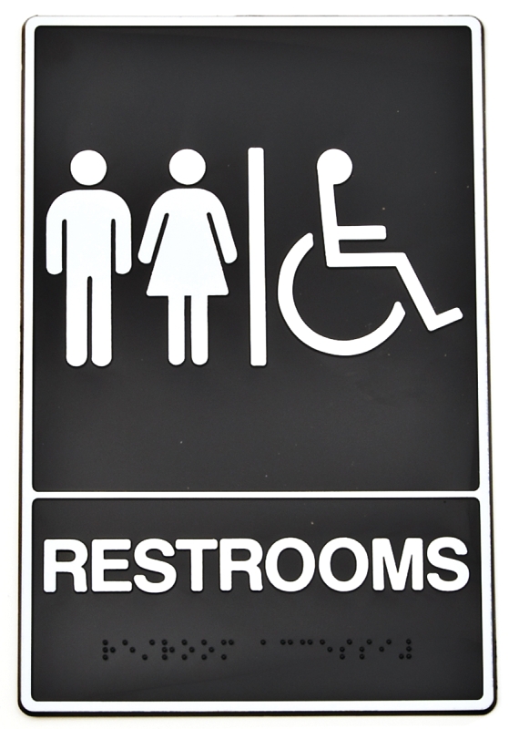Braille 2 raised lettering and graphics meet ADA requirements. Made of heavy-duty plastic with contrasting eggshell finish and self-adhesive tabs. Packaged for the customer to feel the contour of the sign. Sign shows handicap symbol and states “RESTROOMS”.