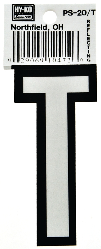 Hy-Ko PS-20/T Reflective Letter, Character: T, 3-1/4 in H Character, Black/White Character, Vinyl