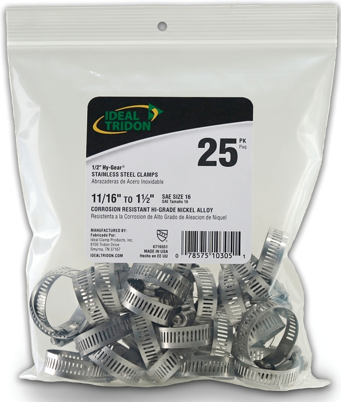 Ideal-Tridon Hy-Gear 67-6 Worm Gear Hose Clamp, Nominal Opening Size: 11/16 to 1-1/2 in, Hex Bolt Size: 5/16 in, Trade Size: #16, 316 Grade, 1/2 in W, Bolt Material: Stainless Steel, Stainless Steel
