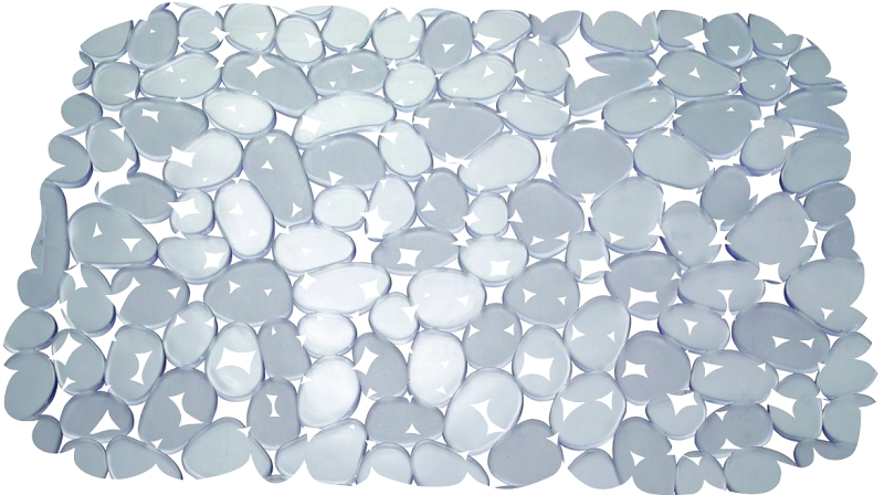 Unique pebble design. Mat can be customized for drain by cutting away pebbles. Packaged with header card.