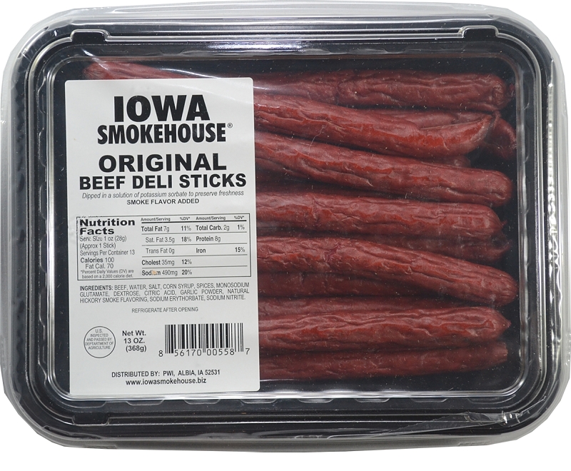 Iowa Smokehouse Beef Deli Stick, Pack, Net Content: 13 oz, Flavor: Original, Nutritional Information: 100 Calories, 7 g Total Fat, 3.5 g Saturated Fat, 0 g Trans Fat, 35 mg Cholesterol, 490 mg Sodium, 2 g Total Carbs, 8 g Protein, Ingredients: Beef, Water, Salt, Corn Syrup, Spices, Monosodium Glutamate, Dextrose, Citric Acid, Garlic Powder, Natural Hickory Smoke Flavoring, Sodium Erythorbate, Sodium Nitrite, Servings: 13