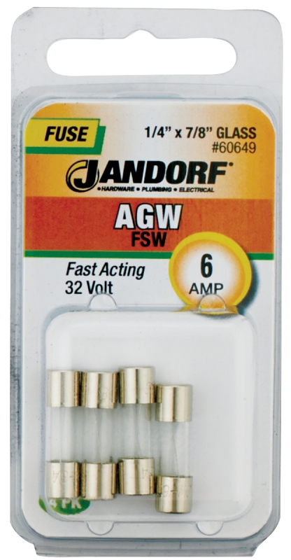 Jandorf 60649 Fast Acting Fuse, 6 A, 32 V, 10 kA Interrupt, Glass Body