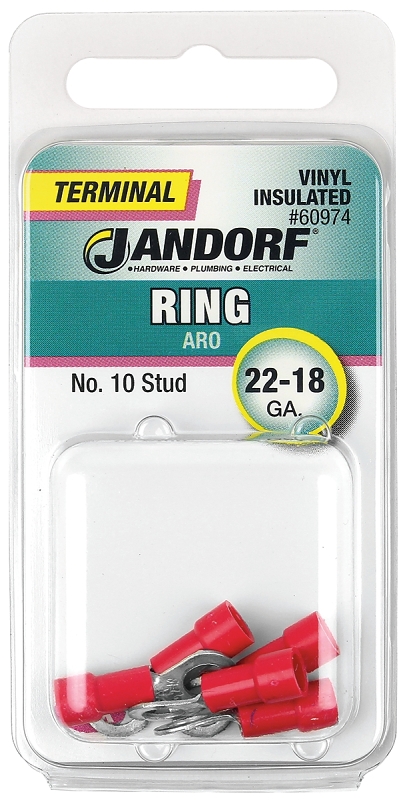 Jandorf 60974 Ring Terminal, 22 to 18 AWG Wire, #10 Stud, Vinyl Insulation, Copper Contact, Red