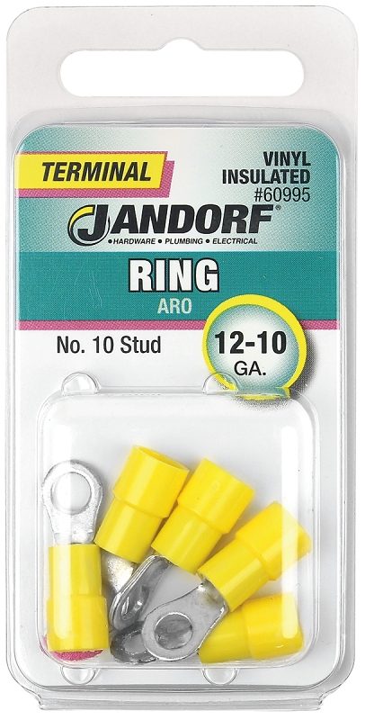 Jandorf 60995 Ring Terminal, 12 to 10 AWG Wire, #10 Stud, Vinyl Insulation, Copper Contact, Yellow