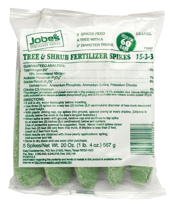 It’s no secret that beautiful, healthy trees make your yard look spectacular. Jobe’s fertilizer spikes for trees and shrubs ensure a continuous supply of nutrients below the surface, where the trees active roots are growing. Jobe’s spikes are easy to insert around each tree’s dripline and the slow-release formula lasts all season. No wasteful runoff, no mess, hazards or smells – only a safe beautiful yard. For best results, use Jobe’s fertilizer spikes for trees and shrubs in early spring and late fall.