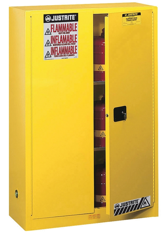 Protect workers, reduce fire risks and improve productivity by storing flammable fuels and chemicals in code-compliant safety cabinets. Sure-Grip® EX cabinets are constructed of sturdy 18 ga thick double-wall, welded steel with 1-1/2 in of insulating air space for fire resistance. High-performance, self-latching doors close easily and securely for maximum protection under fire conditions. Fail-safe closing mechanism ensures three-point stainless steel bullet latching system works every time. For added security, U-Loc™ handle comes with a cylinder lock and key set or accepts an optional padlock. Haz-Alert™ reflective warning labels are highly visible under fire conditions or during power outages when illuminated with a flashlight. Patented SpillSlope® galvanized steel shelves direct spills to back and bottom of a leak-proof 2 in bottom sump. They adjust on 3 in centers for versatile storage. Cabinets also feature dual vents with flame arresters, four adjustable self-leveling feet, grounding connector and trilingual warning label.