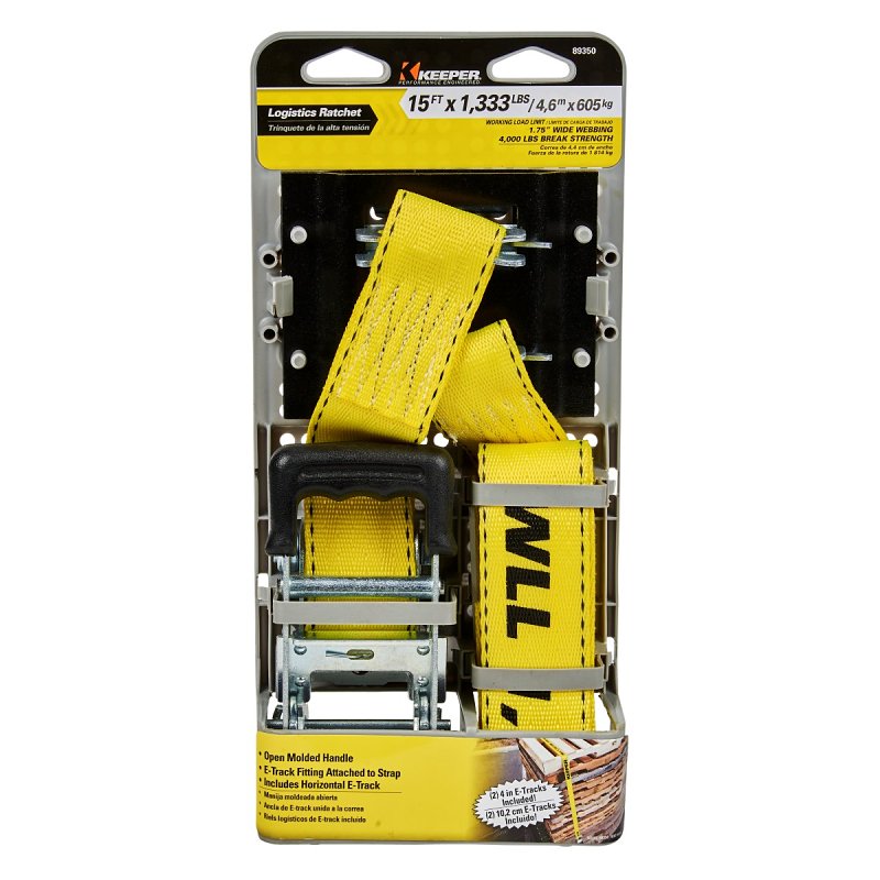 The Keeper® 15 ft x 1-3/4 in Logistic ratchet tie-down comes with E-Track Fitting attached to the strap and Horizontal E-Tracks to attach to your trailer. This tie-down is rated for a 1333 lb working load limit and 4000 lb break strength, making it ideal for industrial applications. Keeper® webbing is designed to remain tough even when subjected to weather and abrasion. A spring-loaded release mechanism ensures that the ratchet will never open accidentally and a open molded grip ratchet handle increases speed and comfort.