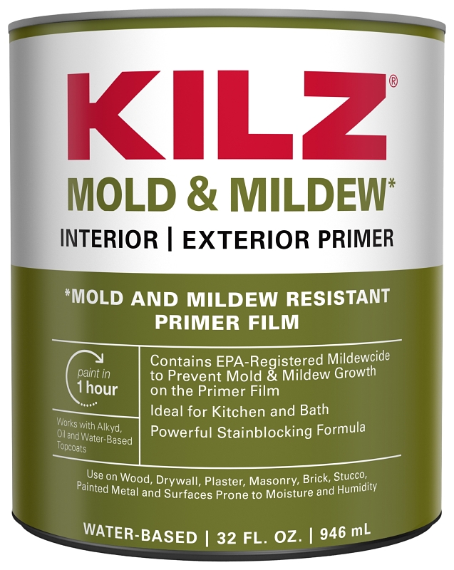All New KILZ® mold and mildew primer is a water-based primer-sealer-stainblocker that is specially designed for residential surfaces in high humidity, moisture and temperature environments such as kitchens, bathrooms, powder rooms and laundry rooms. It offers excellent adhesion to both interior and exterior surfaces and provides a sound anchor for paints. The EPA registered active ingredient creates a mold and mildew-resistant film that protects the primer film from mold and mildew growth. KILZ mold and mildew Primer will block most medium to heavy stains including felt marker, grease, ink, pencil, tannin and water stains. It is a fast drying, low odor, very low VOC formula and is easy to clean with soap and water. Not recommended for floors.