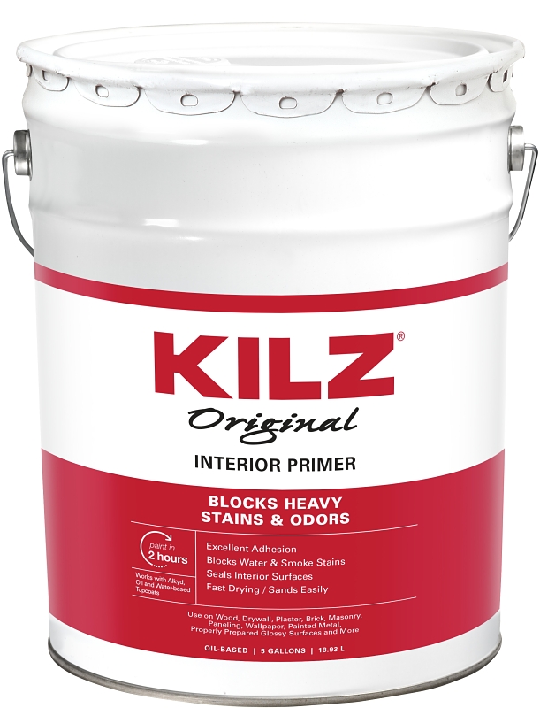 Kilz® original primer blocks most stains including water, smoke, tannin, ink, pencil, felt marker and grease and seals pet and smoke odors. Use on interior surfaces including wood, drywall, plaster, paneling, wallpaper, masonry, brick, painted metal and properly prepared glossy surfaces.