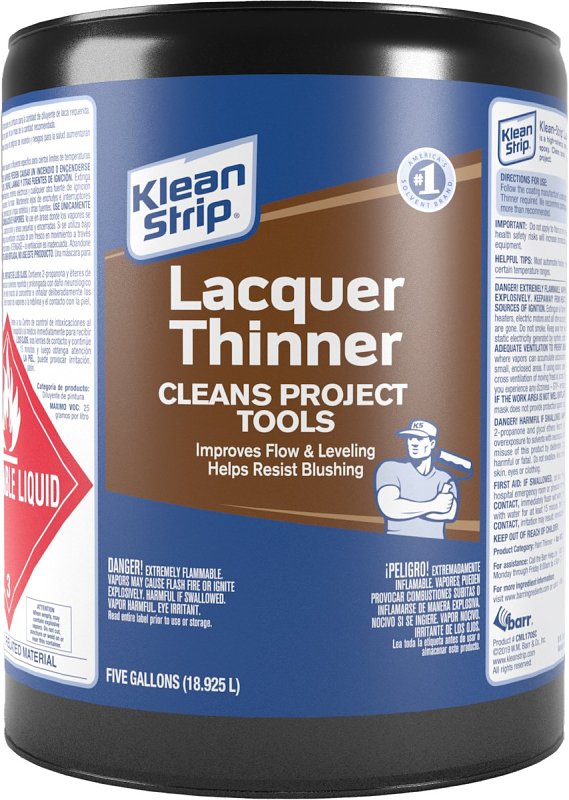 Klean Strip Lacquer Thinner, Liquid, Clear, Odor/Scent: Characteristic Ketone, Net Content: 5 gal, Compositions: Acetone {2-Propanone}, Ethanol, 2-Butoxy- {Ethylene Glycol N-Butyl Ether, (A Glycol Ether)}, VOC Content: 24 gal/L, Flash Point: -4 deg F, Flammability Rating: 3, Density: 6.597 lb/gal, Specific Gravity: 0.7837 to 0.793