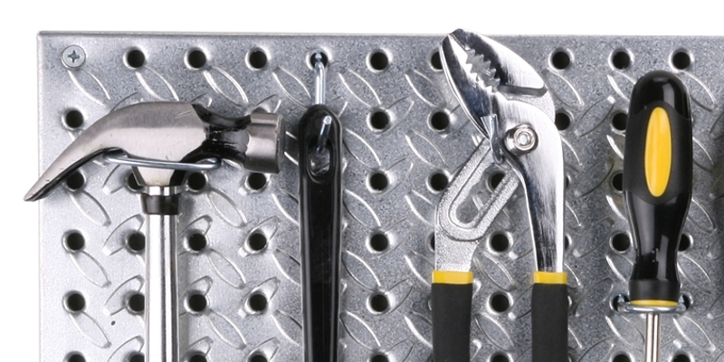 The 16 in x 32 in diamond plate embossed pegboard features heavy-duty galvanized steel construction that prevents sagging and tearing. Holes 1/4 in Dia accommodate regular and heavy-duty peg hooks to provide durable and versatile storage for a wide range of items. Corrosion-resistant finish.