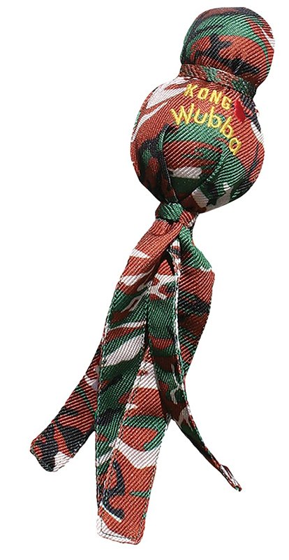 The Kong camo Wubba™ is a fun, interactive tug and toss toy that is great for interactive or solo play. It’s long floppy tails are ideal for shaking and tugging instincts as well as games of fetch. A durable reinforced nylon exterior combines with unique ball shapes for play sessions that last longer. Dogs love to squeak the camo Wubba™ and add to the fun by shaking the flapping tails back and forth making every game different from the next.