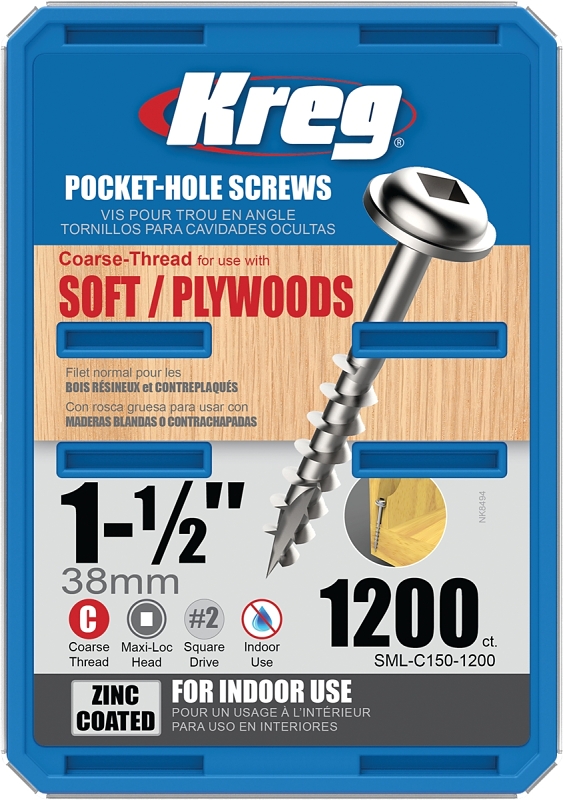 Kreg SML-C150-1200 Pocket-Hole Screw, #8 Thread, 1-1/2 in L, Coarse Thread, Maxi-Loc Head, Square Drive, Carbon Steel