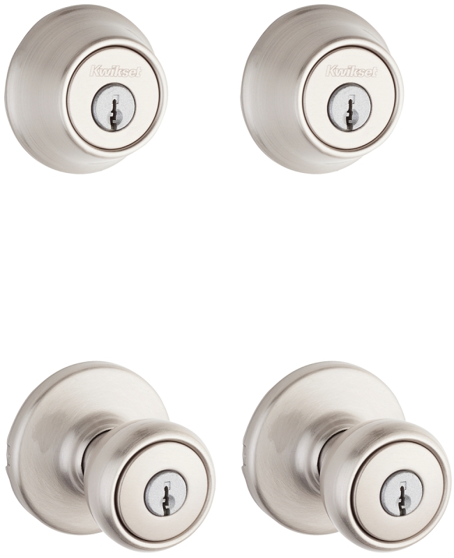 Includes two Tylo entry knob locksets and two #660 deadbolts. Knobs locked or unlocked by key outside or turn button inside. Deadbolt operated by key outside and thumb turn inside. Security knobs feature full 1 in solid core throw bolt, all-metal mechanisms, anti-pry shield 5-pin system. Door prep 2-1/8 in cross bore, 1 in edge bore, 1 in x 2-1/4 in latch face. Backset of 2-3/8 in standard and adjustable 2-3/8 in and 2-3/4 in optional. Door thickness 1-3/8 to 1-3/4 in. Cylinder 5-pin. Faceplates of 1 in x 2-1/4 in round corner. Strikes of 2-1/4 in full lip. Bolt knob 1/2 in throw, deadbolt 1 in throw. Reversible for right or left-hand doors. ANSI/BHMA knob Grade 3, deadbolt Grade 3.