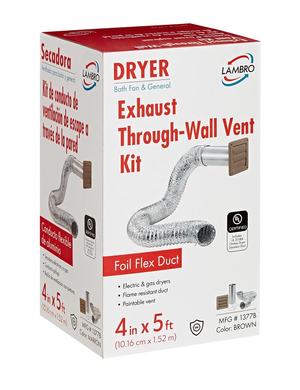 The Lambro brown plastic louvered clothes dryer exhaust vent kit featuring 4 in x 5 ft foil flex UL 2158A is ideal for venting through the wall. This kit is used for clothes dryer exhaust and other general venting applications that require moist air and humidity from exiting the home. The built in flaps prevent back drafts and critters from entering the home through the vent. The plastic vent has a UV additive to prevent premature fading due to the sun.