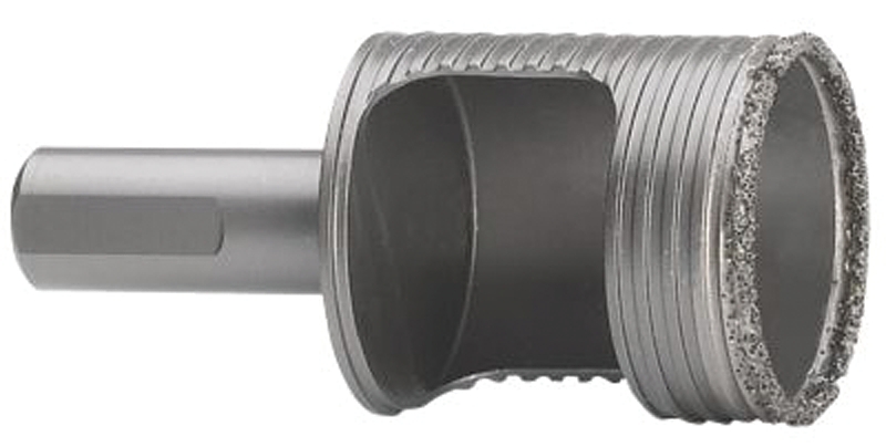No arbor required. Split point pilot bit for faster penetration and less walking. Over sized slot in hole saw for easy plug removal with low torque, little pressure required for fast, easy cutting. Continuous, brazed edge lasts longer in tile and stone.