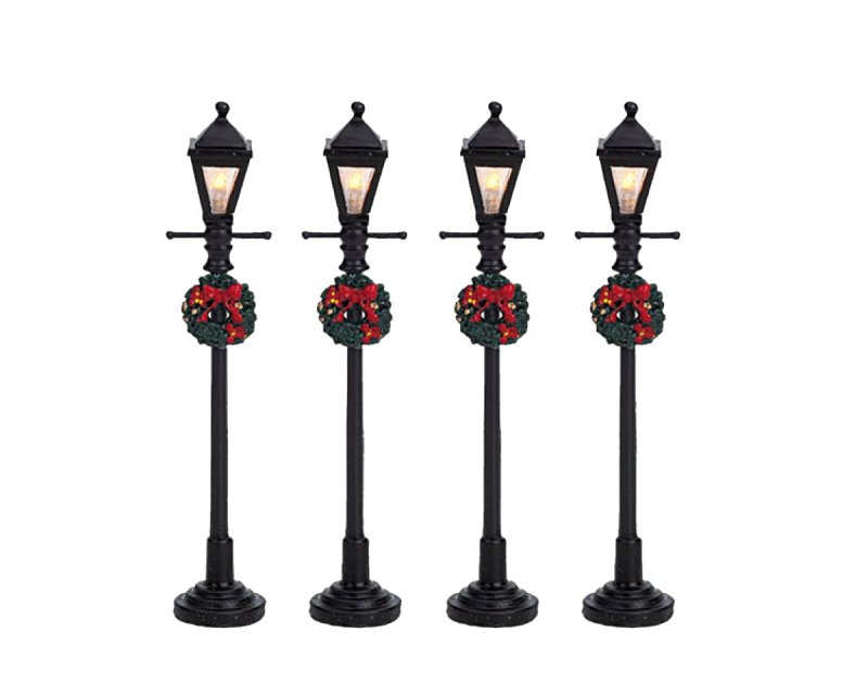 Add classic black, cast-iron-like Gas Lantern Street Lamp to a Christmas Village scene and you’ll have a source of light and a vintage, eye-catching feature. Each lamp, which come in a set of four, features a festive wreath and a bright, working light.