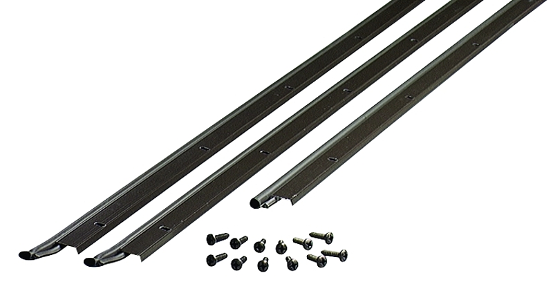 Made of aluminum and vinyl. Nail fasteners for wood frame doors, screw fasteners for wood or steel frame doors. Fasteners included. Install on doorstop. Slotted fastener holes provide easy installation and adjustment. Includes 3-Piece.