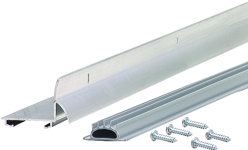 L-shaped DCV 50 door bottom fits both 1-3/8 in and 1-3/4 in doors. Seals between bottom of door and threshold to block out air and moisture. Slotted fastener holes allow easy installation and adjustment. 1-3/32 in height drip cap and 1/2 in height door bottom.