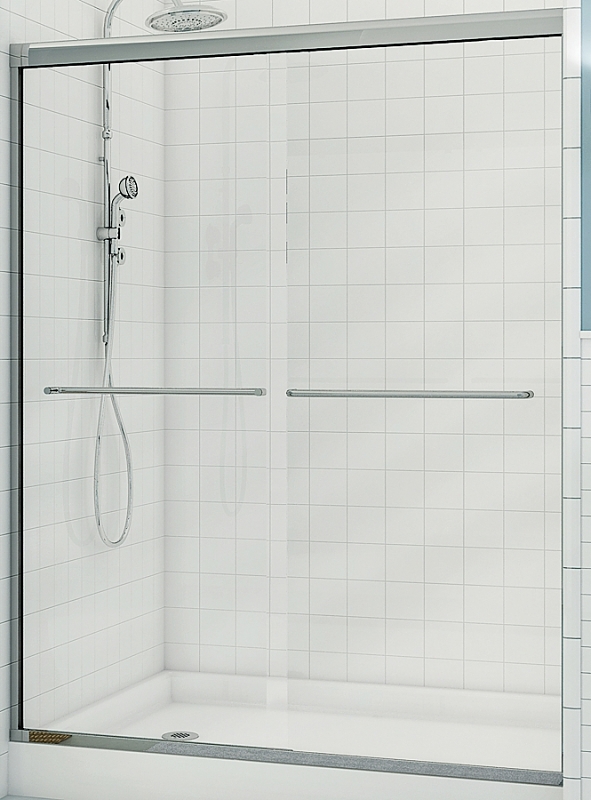 Two-panel 1/4 in./6 mm sliding door for alcove shower door, clear tempered safety glass, silent guide eliminates rattling noise, high quality rollers, header lock and panel anti-jump, Round towel bars, reversible header – one side round and one side flat. 10 years warranty.
